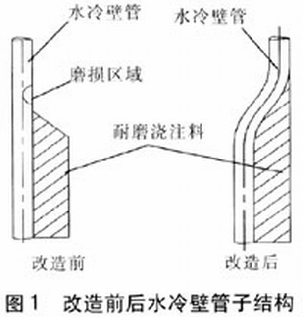 早期運(yùn)行的循環(huán)流化床鍋爐在該部位磨損相當(dāng)嚴(yán)重。目前,“讓管”技術(shù)已被多家循環(huán)流化床鍋爐生產(chǎn)廠家采用,并取得了顯著效果。讓管,即把水冷壁管向爐外彎曲,在進(jìn)行耐磨澆注料搗打施工時(shí),將耐磨澆注料打到水冷壁管彎曲的最內(nèi)側(cè),從而防止了水冷壁磨損。改造前后水冷壁管子結(jié)構(gòu)見(jiàn)圖1。
