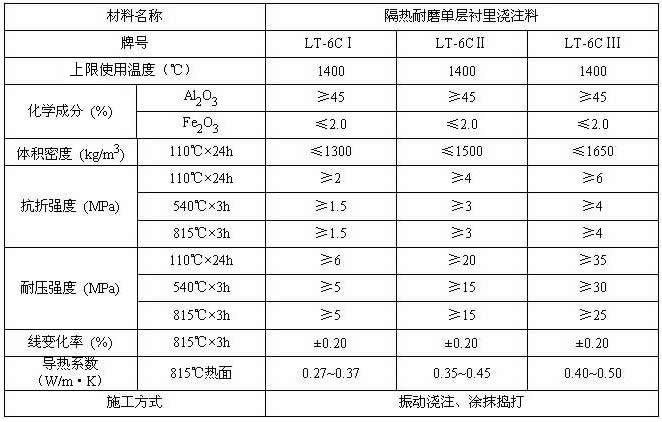【產品名稱】:LT-6C 系列隔熱耐磨單層襯里澆注料