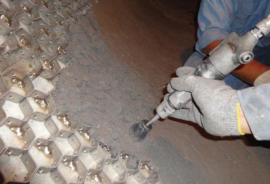 【使用部位】: 循環流化床鍋爐爐膛密相區,布風板,水冷壁延伸墻,爐膛出口,水冷風室等部位,或結構較復雜,無法立模澆注的異型部位。工作溫度900℃左右。