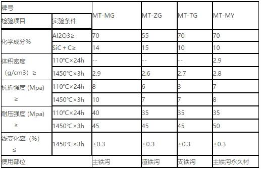 MT-MG、MT-TG、MT-ZG、MT-MY是大型高爐鐵溝配套使用的低水泥耐火澆注料,以棕剛玉、高品質鋁礬土、高純碳化硅等為主材質,以水泥作為結合劑,在該產品中復合加入高性能減水劑和防爆劑提高產品施工性能和使用性能。 材料特性: